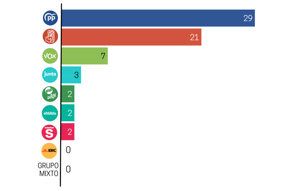 Si se atiende al número absoluto de diputados, el PP concentra más casos (29), seguido del PSOE (21) y Vox (7). En las formaciones más pequeñas las cifras son reducidas: tres en Junts y dos en PNV, EH Bildu y Sumar. Los datos reflejan así una doble realidad: mientras el peso numérico recae en los partidos mayoritarios, proporcionalmente son algunas fuerzas nacionalistas las que presentan mayor presencia de diputados con ingresos por alquileres.