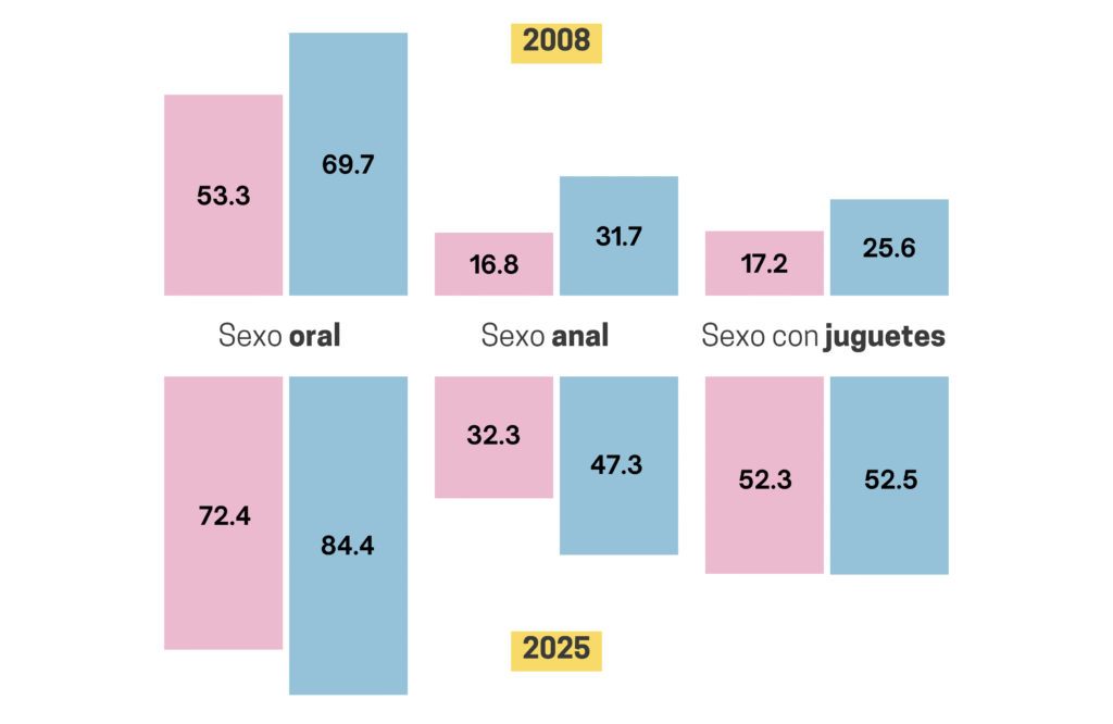 Porcentaje de gente que practica sexo oral, anal o con juguetes en 2008 y 2025 Fuente: CIS