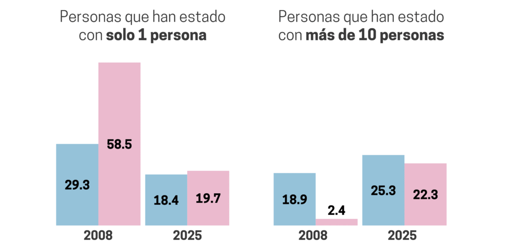 También se observa un reequilibrio en el número de parejas sexuales a lo largo de la vida. En 2008, el 58,5% de las mujeres afirmaba haber estado solo con una persona, frente al 29,3% de los hombres; en 2025, esa diferencia prácticamente desaparece (19,7% frente a 18,4%). En el extremo opuesto, quienes han estado con más de diez personas pasan del 2,4% al 22,3% entre las mujeres y del 18,9% al 25,3% entre los hombres. La brecha de género en este indicador se reduce de forma significativa.