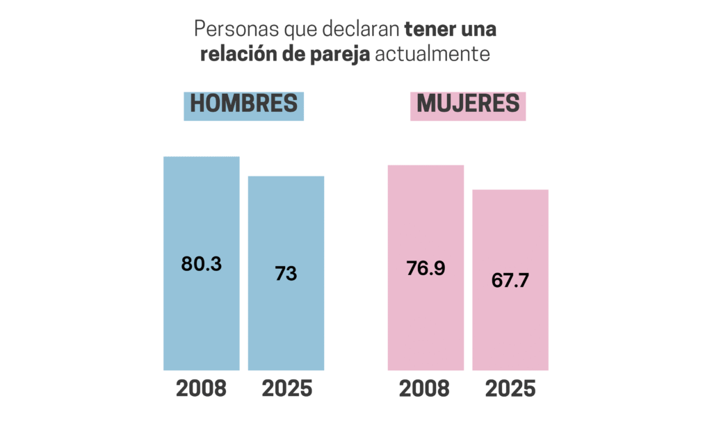 Porcentaje de gente que declara tener una relación de pareja en 2008 y 2025 Fuente: CIS