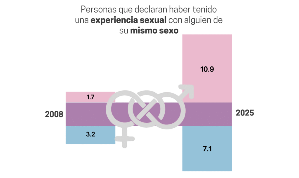 Porcentaje de gente que ha tenido una experiencia sexual con alguien del mismo sexo en 2008 y 2025 Fuente: CIS