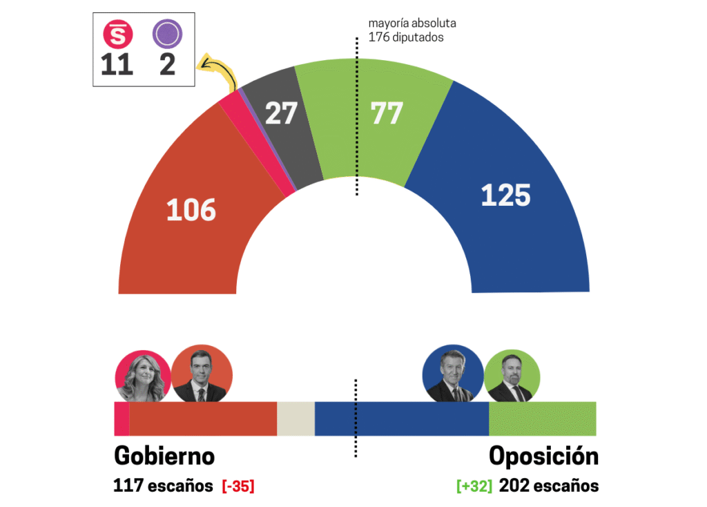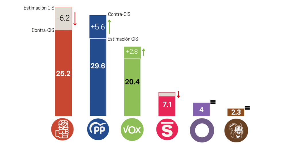 Si se consolidara esta tendencia, el resultado no solo implicaría un cambio de mayoría parlamentaria, sino también una reconfiguración del sistema de partidos, con un PSOE debilitado y un PP que volvería a situarse como fuerza claramente dominante del tablero político.