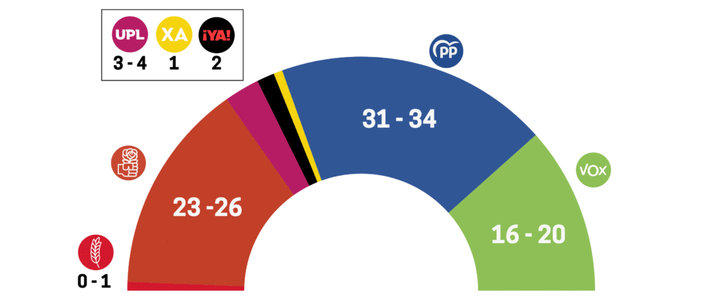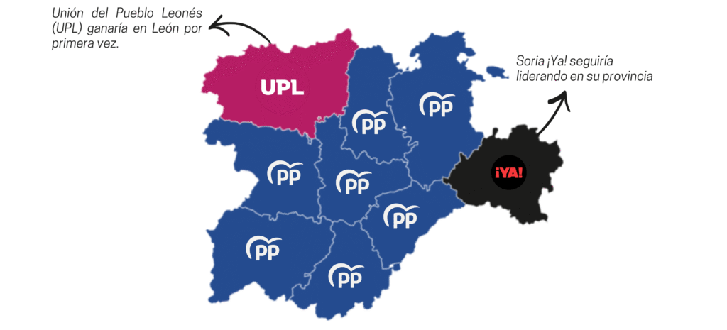 En el ámbito provincial, la proyección apunta a que Unión del Pueblo Leonés (UPL) podría imponerse en León por primera vez, con entre 3 y 4 escaños y un 5,1% de voto estimado. Soria ¡Ya! mantendría el liderazgo en su provincia con hasta 2 procuradores, mientras que Por Ávila podría obtener un escaño. El bloque PP-Vox se situaría así en condiciones de alcanzar la mayoría absoluta en las Cortes autonómicas.