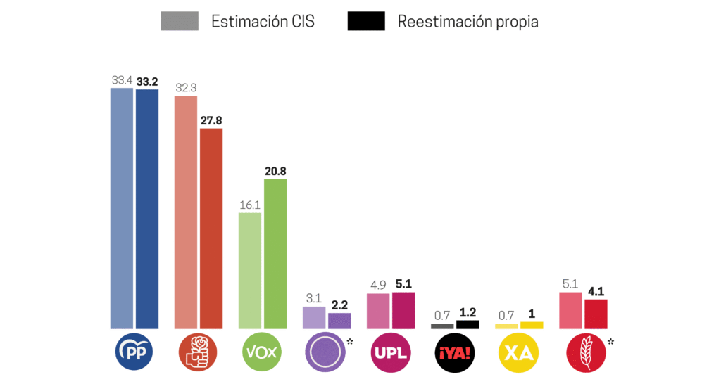 El PSOE, por su parte, quedaría en segunda posición con entre 23 y 26 procuradores, su estimación de voto se corrige a la baja respecto al dato inicial del CIS (27,8% frente a 32,3%). La principal revisión al alza corresponde a Vox, que pasaría del 16,1% al 20,8% en estimación de voto, lo que se traduciría en una horquilla de 16 a 20 escaños. Este ajuste refuerza el papel de la formación como socio determinante en un eventual bloque de derechas.